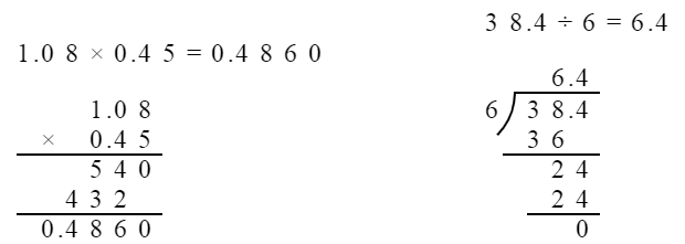 1.08×0.45 38.4÷6 7.24÷2.1(得数保留三位小数)