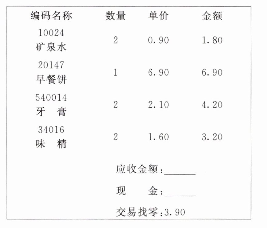 7. 下面是小利的妈妈在超市购物后取回的小票,其中的一些数字被小利涂了。设计成与生活相关的数学题,你会解答吗?