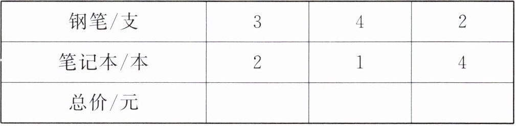 3. 钢笔的单价是a元/支,笔记本的单价是b元/本。你会根据条件填写下表吗?