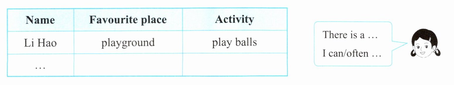 四、Survey, write and say. 请你调查一下同学们喜欢的社区场所及可以进行的活动,完成调查表,然后介绍一下吧。