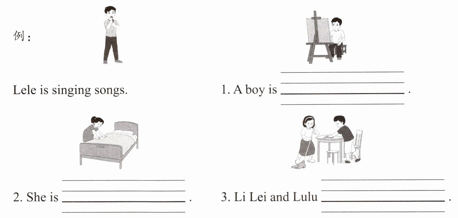 三、Look and write. 在社区的“老人之家”,社区小帮手们正在忙碌着。请看一看,仿照例子,结合图片提示,写出相应的句子。