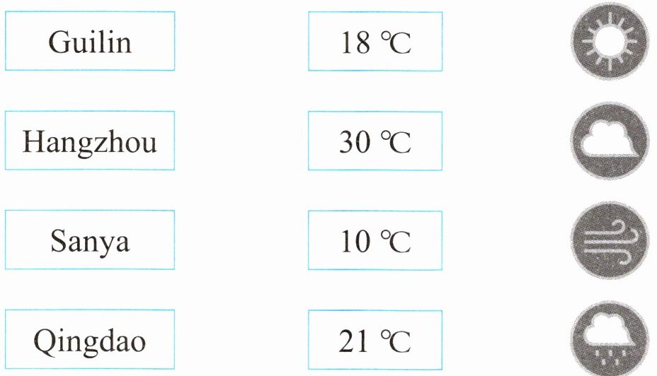 二、Listen and match. Ben 和 Max 正在收听天气预报。请听一听,将城市名称与对应的温度和天气情况连线。