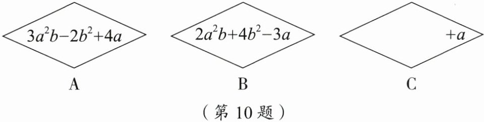 10. 如图,小明准备了三张写有代数式的卡片 $A$,$B$,$C$,并且告诉同桌小华规则为:其中两张卡片上多项式的差等于第三张卡片上的多项式,但卡片 $C$ 上的一部分内容看不清楚了.