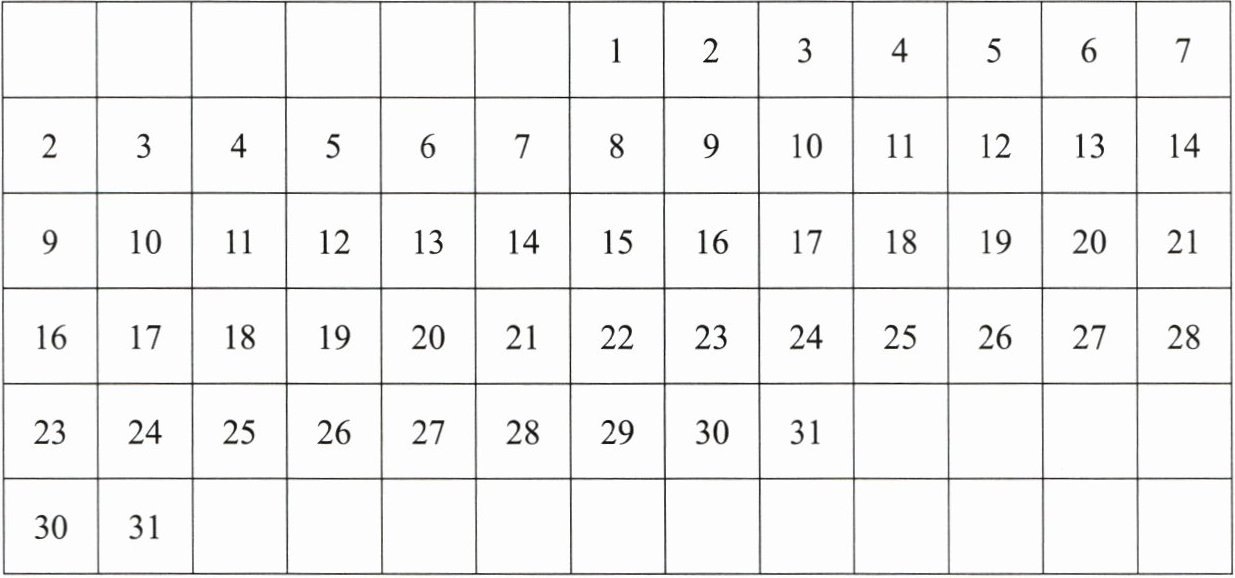 1. 同一行内,数字从左到右依次递增1:即每行连续7列的数字为连续7个日期(如1,2,3,4,5,6,7),对应连续7天,星期几依次递增1。