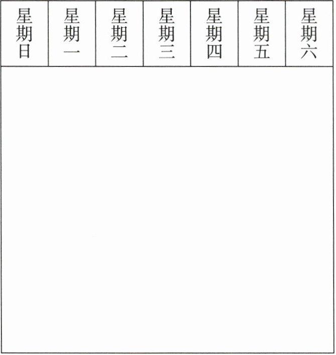 2. 再准备第二张硬卡纸,挖出一个$7\mathrm{cm}×6\mathrm{cm}$的长方形,在长方形的上方标注星期日到星期六,如图 2 所示.