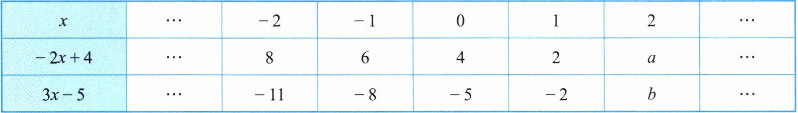 (2) 表中 $ -2x + 4 $ 的值的变化规律为:$ x $ 的值每增加 1,$ -2x + 4 $ 的值就减少 2;类似地,$ 3x - 5 $ 的值的变化规律为:x的值每增加1,3x-5的值就增加3;