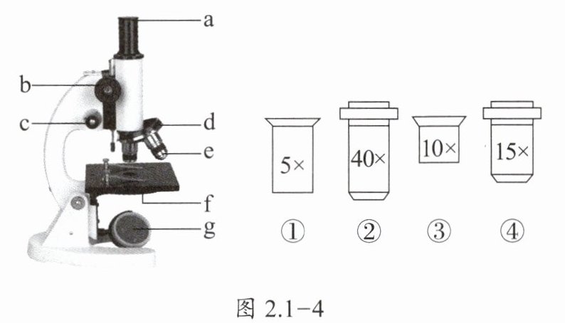 10. 显微镜是生物学研究中常用的观察仪器,在对微小的物体和细胞进行观察时,需要借助显微镜。显微镜的结构和镜头如图 2.1 - 4 所示,小慧在显微镜下观察同一个黑藻叶片细胞临时装片的视野如图 2.1 - 5 所示。回答下列问题。
