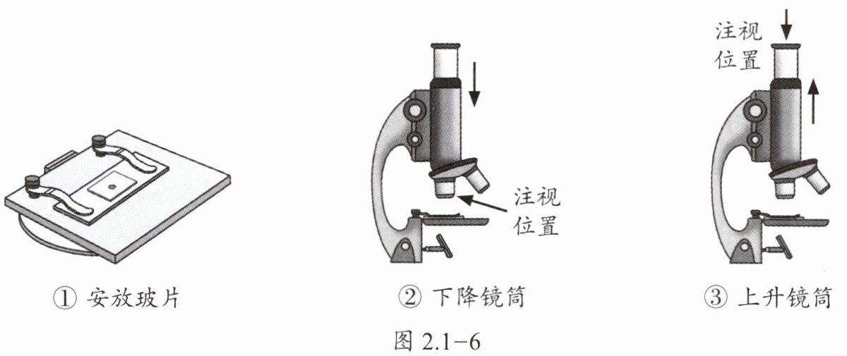 (2)反复调节焦距,始终没有在视野中找到所要观察的物像。其原因可能是图 2.1 - 6 所示①~③操作步骤中的