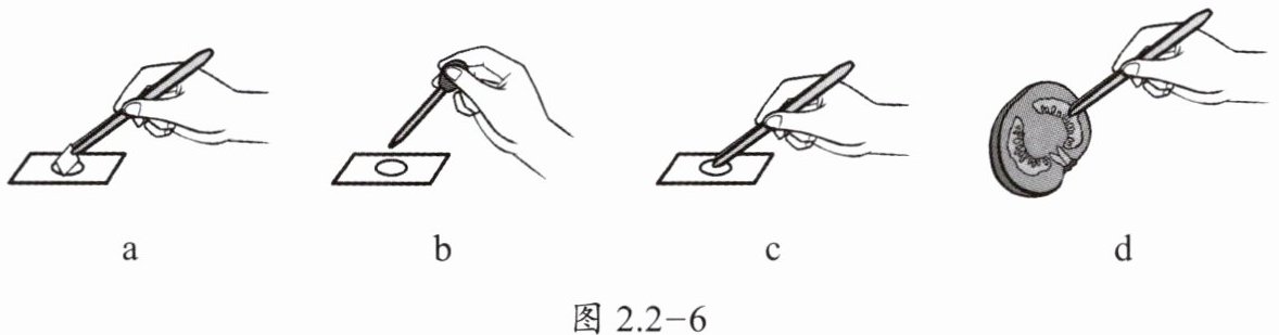 12. 番茄果实营养丰富,为观察其果肉细胞,需制作番茄果肉临时装片,制作装片的几个步骤如图 2.2 - 6 所示。回答下列问题。