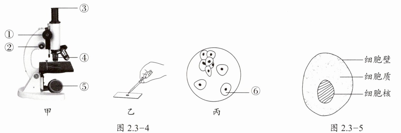 11. 康康同学制作并使用显微镜观察人的口腔上皮细胞临时装片的有关图示如图 2.3 - 4 所示,他观察后绘制的人的口腔上皮细胞结构如图 2.3 - 5 所示。回答下列问题。