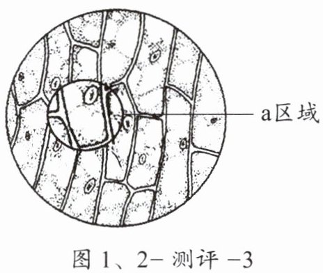 11. 康康用镊子取一块洋葱鳞片叶内表皮,制作了洋葱鳞片叶内表皮细胞玻片标本,用如图1、2 - 测评 - 2所示的显微镜观察后,看到了如图1、2 - 测评 - 3所示的视野。下列叙述正确的是(