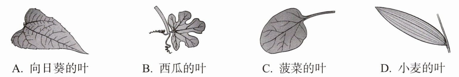 7. 具有网状叶脉的叶片上可以看到一条或数条明显的主脉,主脉经过逐级分支形成许多交错分布的细脉,细脉互相联结形成网状。下列植物的叶片不具有网状叶脉的是(
