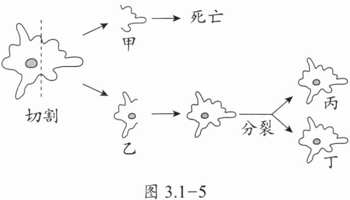 9. 科研人员对一种由单个细胞构成的生物体——变形虫做了如图3.1-5所示的切割实验。回答下列问题。