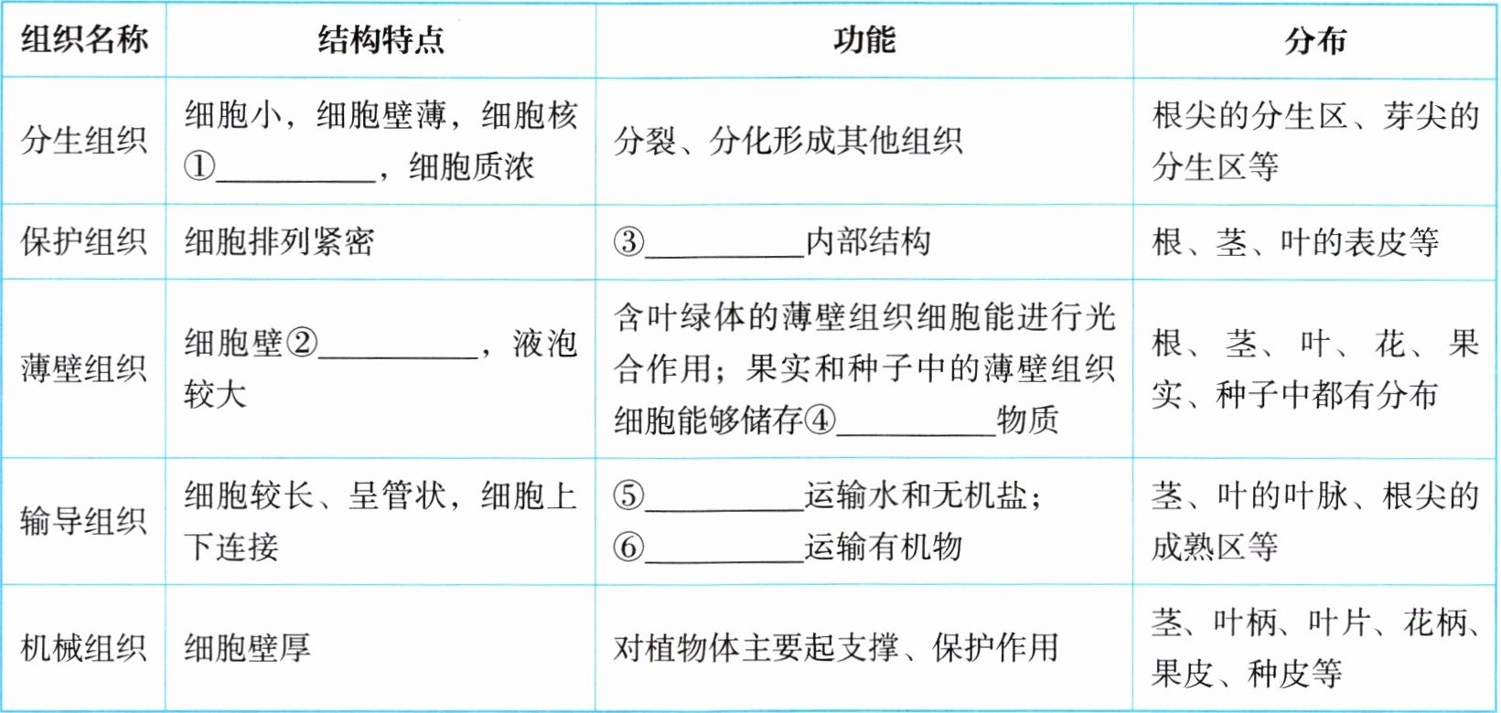 ,细胞质浓|分裂、分化形成其他组织|根尖的分生区、芽尖的分生区等||保护组织|细胞排列紧密|③