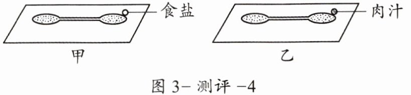 19. 为探究草履虫的趋性,小慧做了以下实验:吸取草履虫培养液,在两片载玻片的两端各滴一滴,然后用牙签在两个液滴之间轻轻地划一下使两个液滴连通;接下来在两片载玻片右侧培养液的边缘分别加入食盐和肉汁(如图3-测评-4所示),用放大镜观察草履虫的运动方向。下列叙述正确的是(
