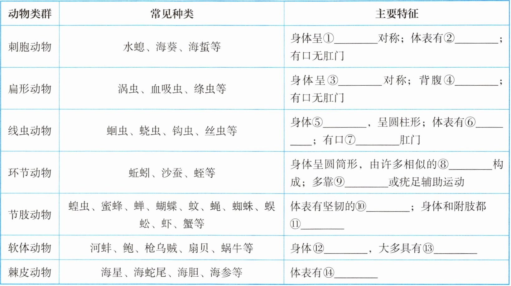 ①辐射 ②刺细胞 ③两侧 ④扁平 ⑤细长 ⑥角质层 ⑦有 ⑧体节 ⑨刚毛 ⑩外骨骼 ⑪分节 ⑫柔软 ⑬贝壳 ⑭棘