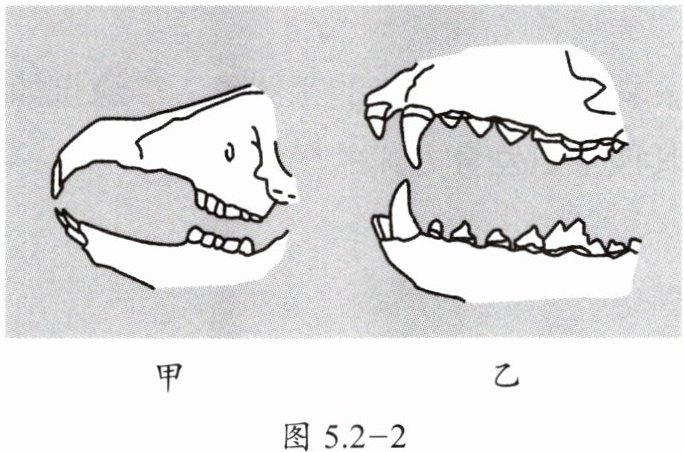(2)猫是鼠的天敌。猫的趾底有脂肪质肉垫,行走无声,捕鼠时不会惊跑鼠,趾端生有锐利的趾甲。猫的牙齿是图5.2-2中的类型