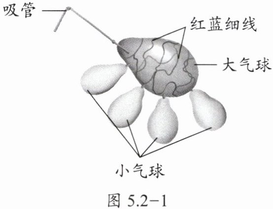 12. 某生物学兴趣小组在学习鸟类的呼吸时,用吸管、皮筋、大气球、小气球、红蓝细线、透明胶带等材料制作了一个鸟类的呼吸系统模型(图5.2-1)。请据图回答下列问题。