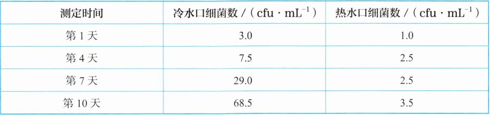 )|测定时间|冷水口细菌数$/(cfu·mL⁻^1)$|热水口细菌数$/(cfu·mL⁻^1)$|