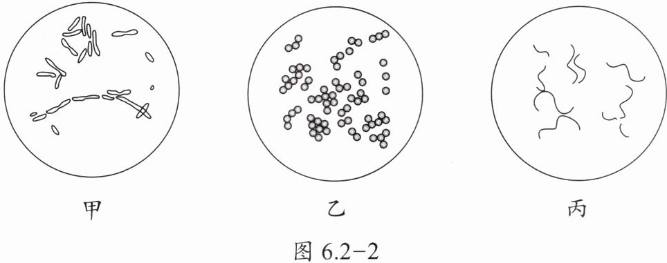 5. 虽然细菌种类很多,但是根据外部形态的不同,大致可以分为如图 6.2 - 2 所示的三种类型。图中甲、乙、丙依次是(