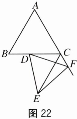 【类比探究】(3)如图22,点F是AC边的延长线上一点,以DF为一边作等边△DEF.直接写出线段CE,CD,CF之间的数量关系,不需证明.