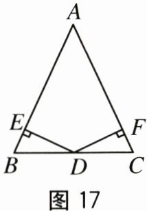 21. (10分)如图17,在△ABC中,AB=AC,D为BC边的中点,过点D作DE⊥AB,DF⊥AC,垂足分别为E,F.