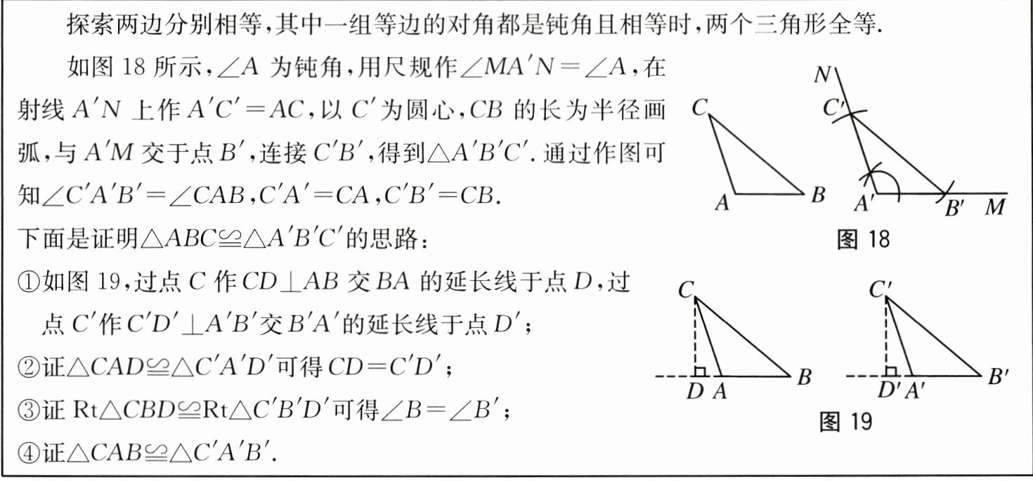 如图18所示,∠A为钝角,用尺规作∠MA'N=∠A,在射线A'N上作A'C'=AC,以C'为圆心,CB的长为半径画弧,与A'M交于点B',连接C'B',得到△A'B'C'.通过作图可知∠C'A'B'=∠CAB,C'A'=CA,C'B'=CB.