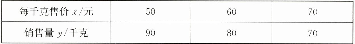 (1)设$y$与$x$之间的函数表达式为$y=kx+b(k\neq0)$,根据题意,得$\begin{cases}50k+b=90,\\60k+b=80.\end{cases}$解得$\begin{cases}k=-1,\\b=140.\end{cases}$