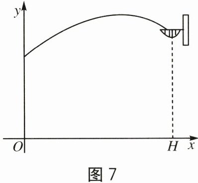 20. (10分)物理上对抛物线的定义:物体受到一个恒定不变的力的作用,并且初速度的方向与此力不在一条直线上,那么物体运行的轨迹就是一条抛物线.假设投篮时,篮球在空中仅受重力作用,大小方向不变,且初速度方向与重力不共线,可见投篮时篮球在空中运行的轨迹是一条抛物线.小明是一名篮球运动员,有一次他在进行投篮训练时,篮球沿抛物线 $ y = - \frac{1}{5}x^{2} + x + \frac{9}{4} $ 运行,然后准确落入篮筐内,其中 $ x(m) $ 是篮球与小明的水平距离,$ y(m) $ 是篮球行进高度,如图7所示.已知篮筐的中心离地面的高度为 $ 3.05m $.