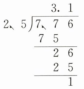 5. 如右图,小李列竖式计算$7.76÷2.5$的商,当商到$3.1余数为1$时,余数$1$表示( )。