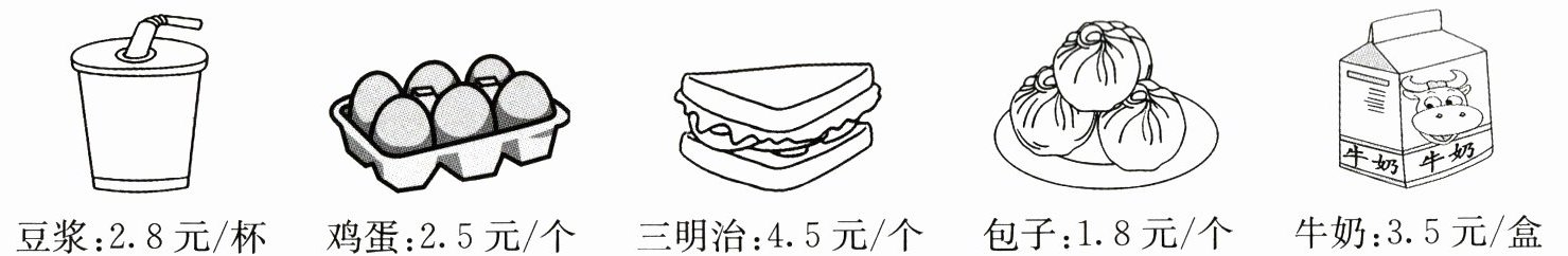 豆浆:2.8元/杯 鸡蛋:2.5元/个 三明治:4.5元/个 包子:1.8元/个 牛奶:3.5元/盒