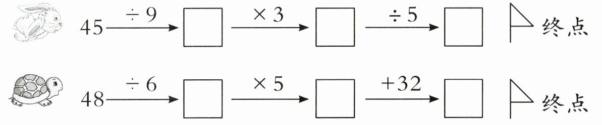 $45\xrightarrow{÷ 9}□ \xrightarrow{× 3}□ \xrightarrow{÷ 5}□ $