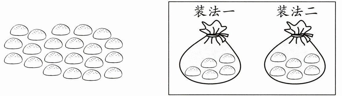 2. 有21个馒头,选择一种装法圈一圈、填一填。