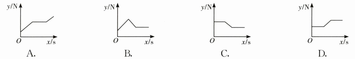 5. 如图2,用弹簧测力计将一块金属悬于盛有水的水槽中,然后匀速向上提起,使金属块完全露出水面,并上升一定高度.下列能反映弹簧测力计的读数$y \ N$与金属块被提起的时间$x \ s$之间的函数关系的大致图象是(