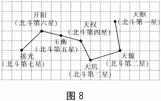 17. (本题满分8分)北斗七星这一天文现象在我国历史文化中占据重要地位,不仅在古代航海中被用于导航,还频繁出现在各种文化传说中.北斗七星是由天枢、天璇、天玑、天权、玉衡、开阳、摇光七星组成,古人把这七星联系起来想象成为古代舀酒的斗形.其大致图象如图8所示(七颗星位于格点或格点连线的中点处).请你建立适当的平面直角坐标系,再分别写出七颗星的坐标.