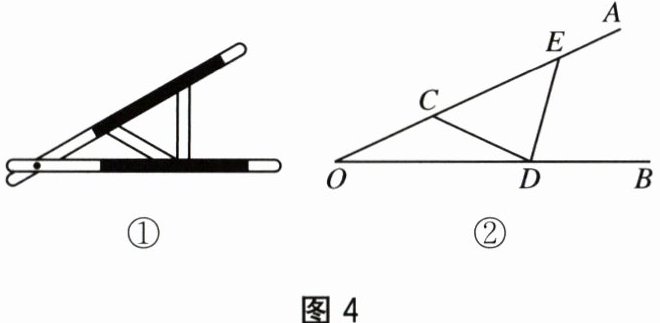 7. “三等分角”大约是在公元前五世纪由古希腊人提出来的,借助如图 4①所示的“三等分角仪”能三等分任一角。这个三等分角仪(示意图如图 4②)由两根有槽的棒 $OA$,$OB$ 组成,两根棒在 $O$ 点相连并可绕点 $O$ 转动,点 $C$ 固定,$OC = CD = DE$,点 $D$,$E$ 可在槽中滑动。若 $\angle BDE = 75^{\circ}$,则 $\angle CDE$ 的度数是(
