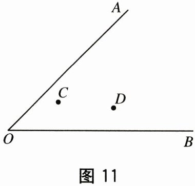 15. (10 分)在图 11 中作出点 $P$,使得点 $P$ 到 $C$,$D$ 两点的距离相等,并且点 $P$ 到 $OA$,$OB$ 的距离也相等。(用尺规法作图,保留作图痕迹,不写作法)
