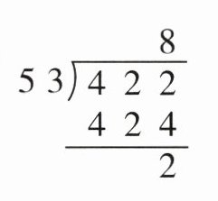 (4) 错误:商8时,53×8=424>422,商偏大。