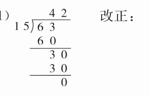 (1) $\begin{array}{r}42\\15\enclose{longdiv}{63}\\60\\\hline30\\30\\\hline0\end{array}$ 改正: