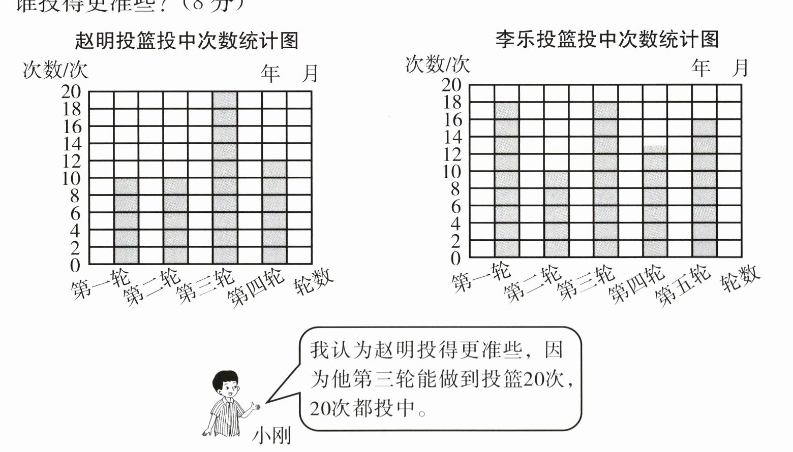 3. 赵明和李乐进行投篮比赛,下面是他们每轮投篮 20 次投中次数的统计图。谁投得更准些? (8 分)