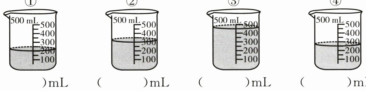4. 下面量杯里的液体各有多少毫升? (14分)