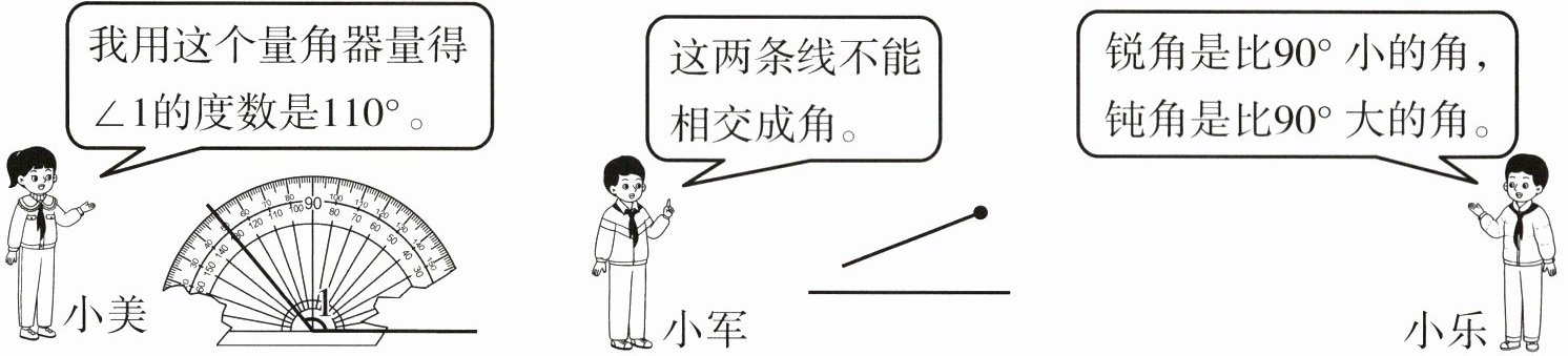 直线外一点到已知直线的垂直线段最短 4. 小军说法不合理,因为直线和射线是可以无限延长的,当它们相交时,交点就是角的顶点;小乐说法也不合理,钝角是比90°大且比180°小的角 5. 这个说法不正确,3时30分时针与分针形成较小的夹角是锐角不是直角