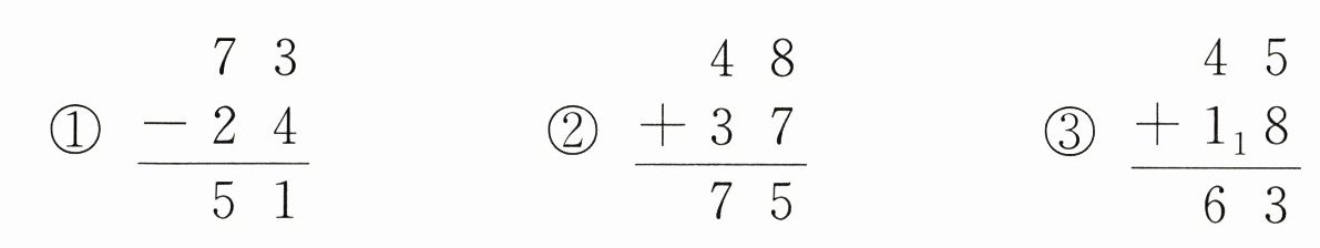 )。①$\begin{array}{r}73\\-24\\\hline51\end{array}$ ②$\begin{array}{r}48\\+37\\\hline75\end{array}$ ③$\begin{array}{r}45\\+1_{1}8\\\hline63\end{array}$