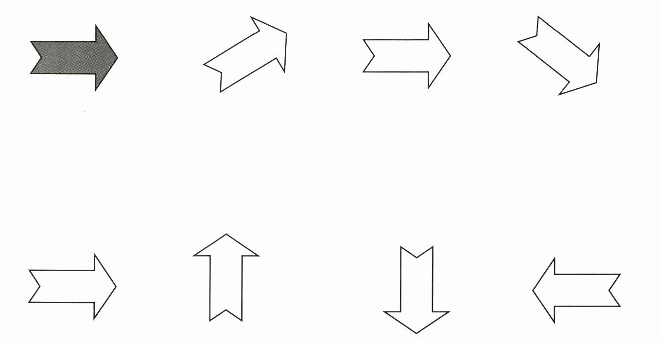 一、下面哪些图形可以通过横向或纵向移动与涂色的图形重合?请圈出来。
