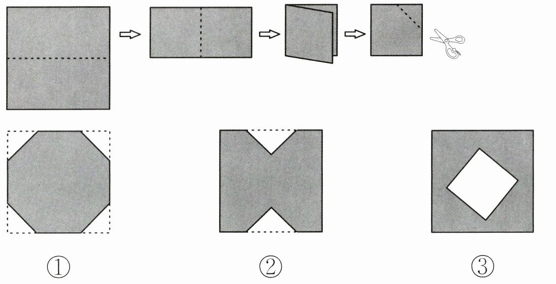4. 如图,将一张正方形纸片沿虚线向上对折,再沿虚线向右对折,得到一个正方形,最后沿虚线剪下一个角。将这张纸片展开后,得到的图形是(