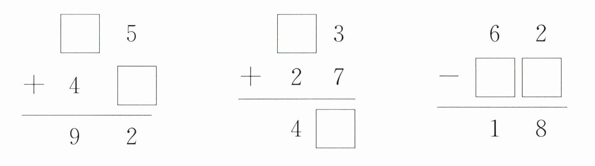 $\begin{array}{r}□ 5\\ +4□ \\ \hline 92\end{array}$ $\begin{array}{r}□ 3\\ +27\\ \hline 4□ \end{array}$ $\begin{array}{r}62\\ -□ □ \\ \hline 18\end{array}$