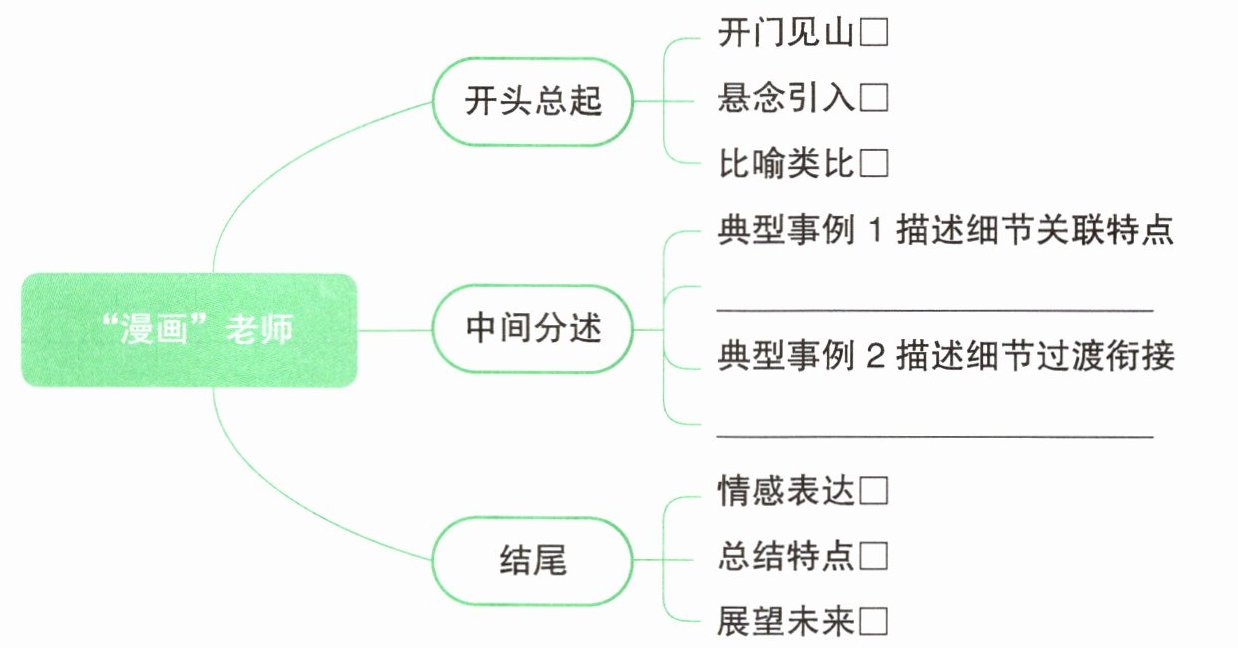 开头总起:开门见山□√;中间分述典型事例2:课堂幽默瞬间;结尾:情感表达□√