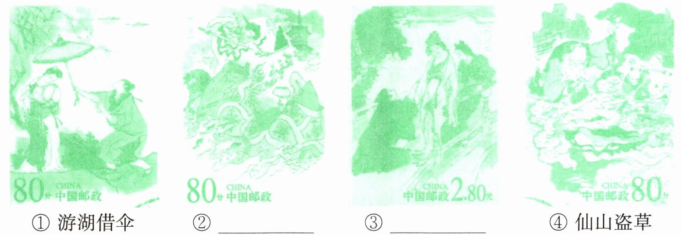 2。下面是民间故事《白蛇传》的邮票,照样子给另外两枚邮票起名字,并排序。