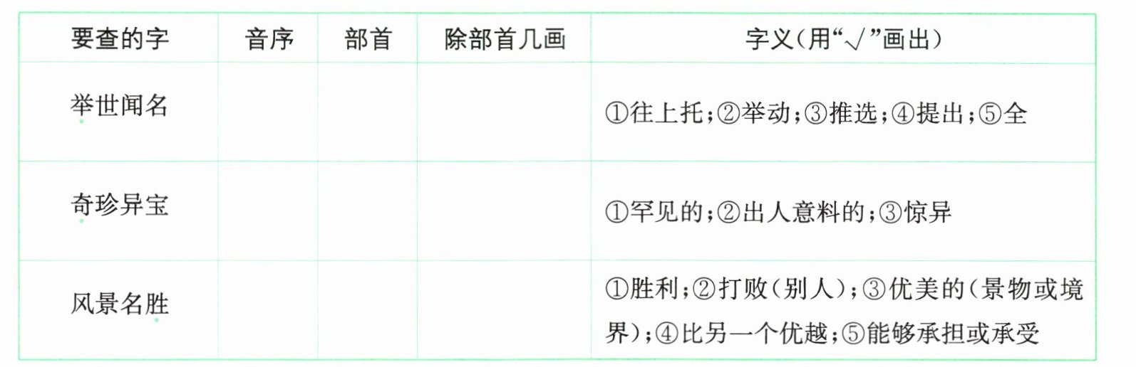 |要查的字|音序|部首|除部首几画|字义(用“√”画出)|