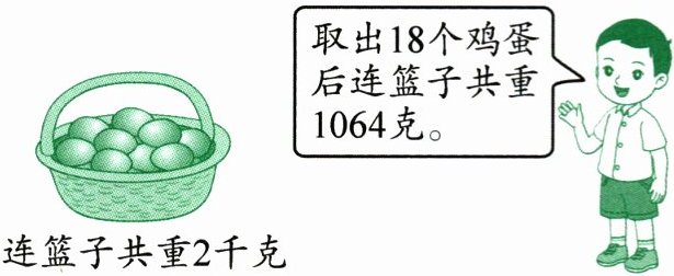 已知连篮子共重$2000$克,取出$18$个鸡蛋后连篮子重$1064$克,那么$18$个鸡蛋重$2000 - 1064 = 936$克。